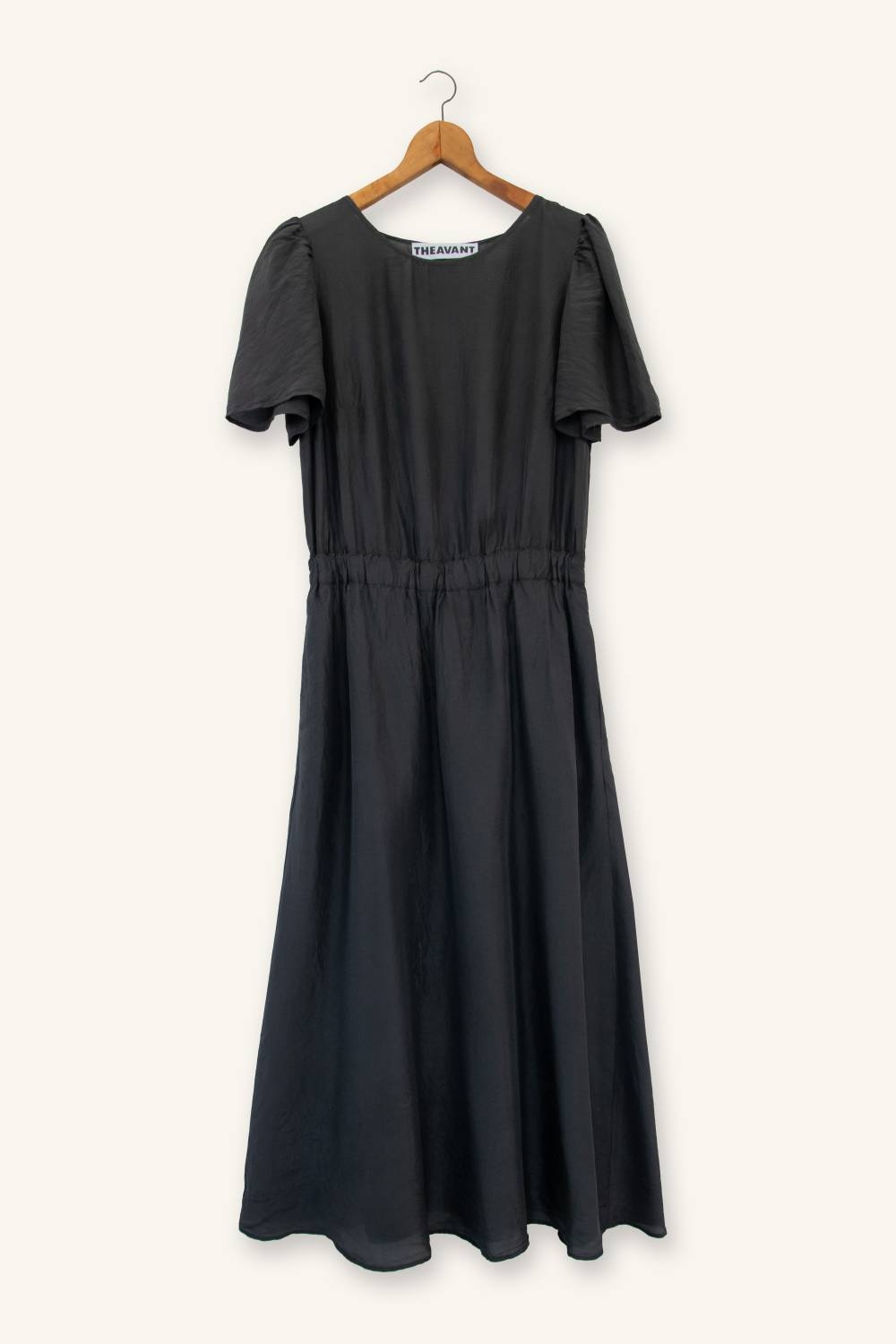 The Coquette dress is crafted from 100% silk pongé, with an inner skirt made from 100% cotton voile. Pongé is a lightweight natural fabric, very fine and soft, with a dense weave. The sleeves are slightly gathered, and the upper sleeve (cap) has a soft volume. The skirt is lined to prevent transparency, especially in lighter colors. The bodice has a semi-fitted shape. The waist features an inner elastic that offers support without feeling tight. The skirt is full and A-line. As this is a garment-dyed piece, the tone appears more intense on the cotton lining than on the silk.