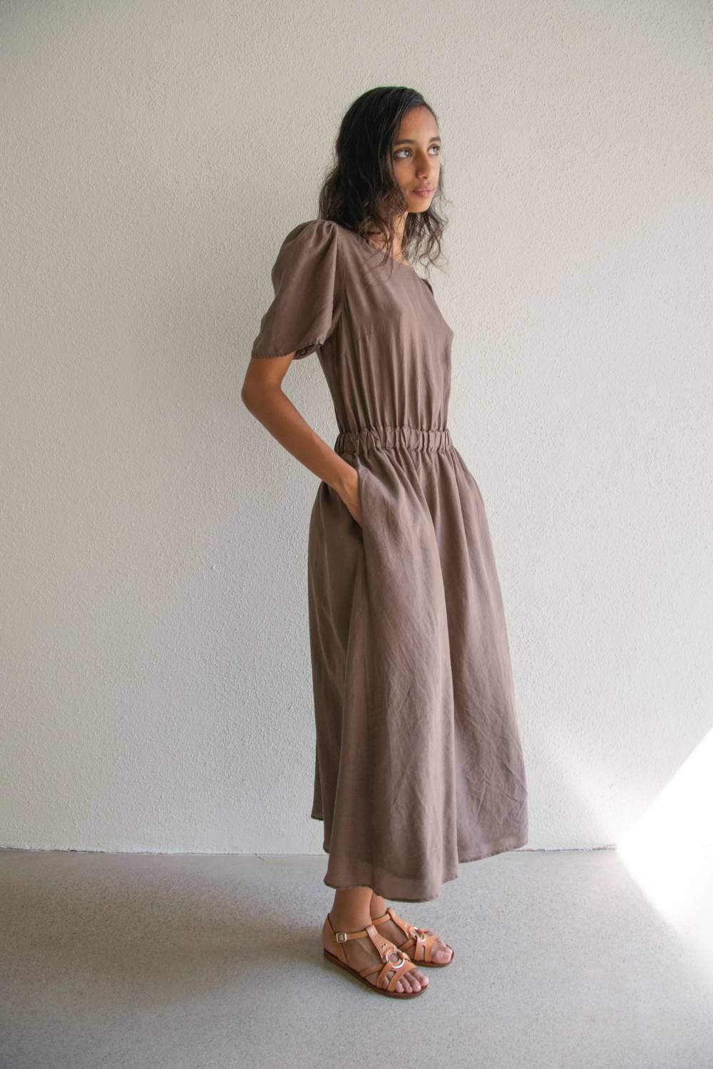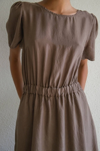 The Coquette dress is crafted from 100% silk pongé, with an inner skirt made from 100% cotton voile. Pongé is a lightweight natural fabric, very fine and soft, with a dense weave. The sleeves are slightly gathered, and the upper sleeve (cap) has a soft volume. The skirt is lined to prevent transparency, especially in lighter colors. The bodice has a semi-fitted shape. The waist features an inner elastic that offers support without feeling tight. The skirt is full and A-line. As this is a garment-dyed piece, the tone appears more intense on the cotton lining than on the silk.