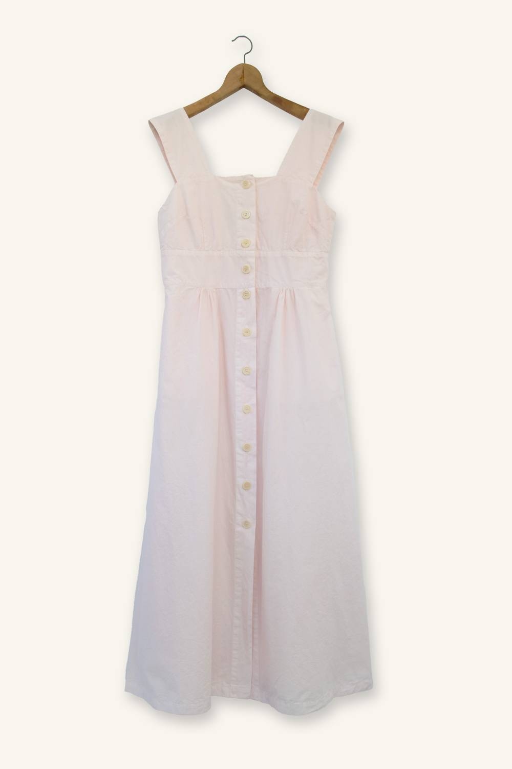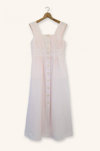 L’Amazone dress is crafted from 100% cotton poplin, a dense, structured fabric with no stretch. Garment-dyeing gives it a soft touch. The bodice is fitted at the bust and waist for a tailored silhouette. The waist sits just below the bust, from where a midi-length A-line skirt flows, with side pockets.