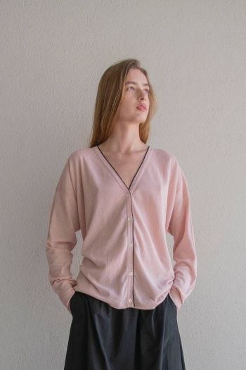Crafted from 100% cotton organza, the Navy cardigan stands out for its lightness and subtle transparency. The deep V-neckline and front button closure create a clean, feminine line, while the delicate contrasting trim subtly defines the silhouette. An airy and elegant piece, designed for effortless layering.