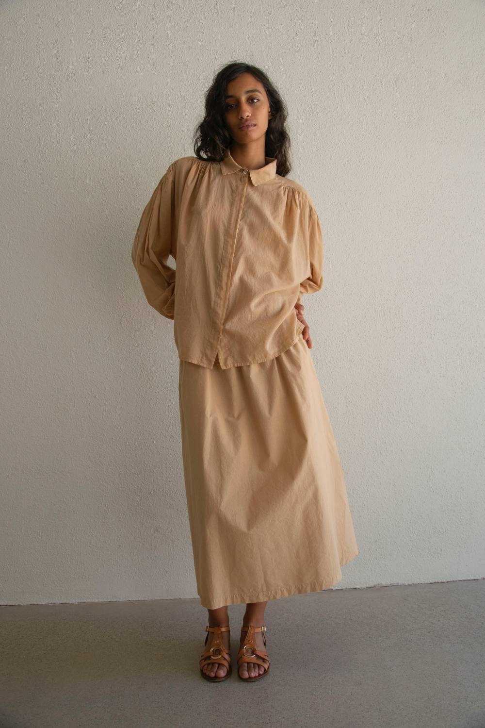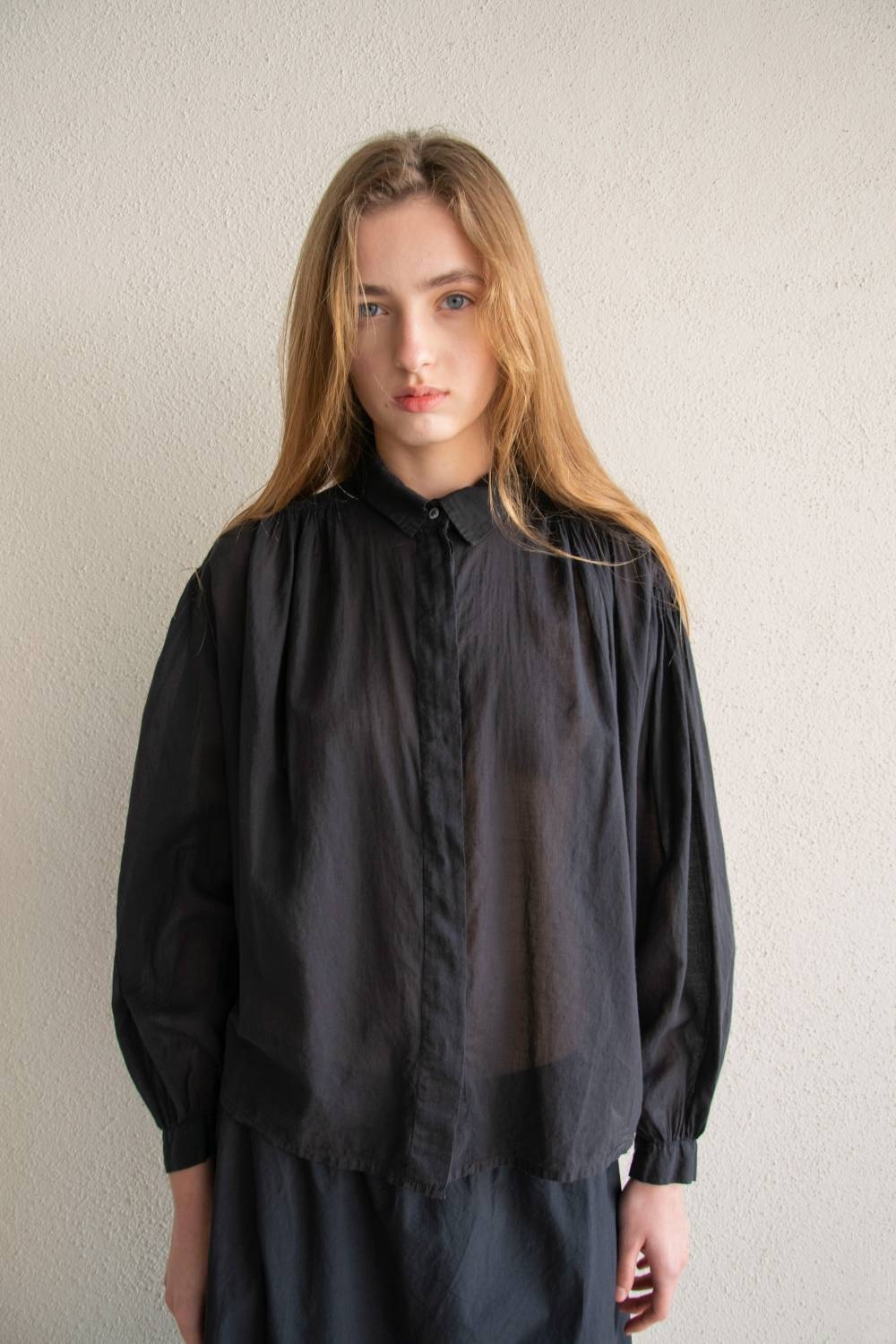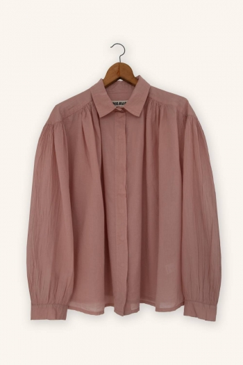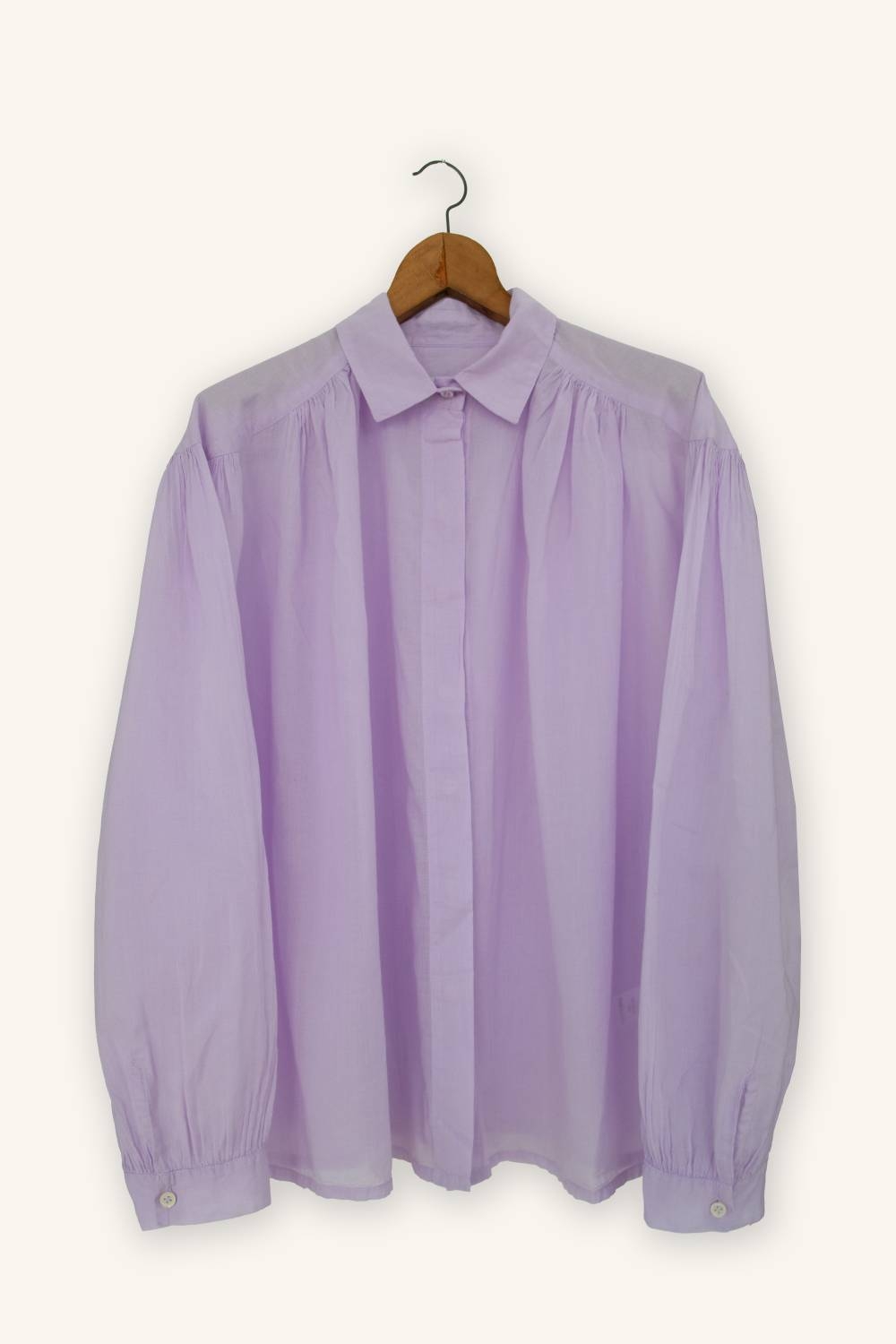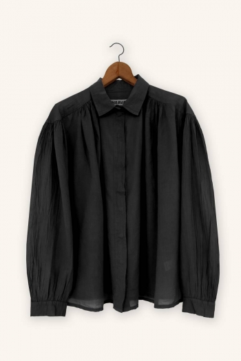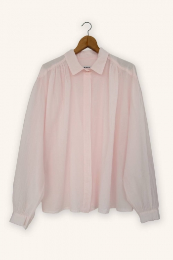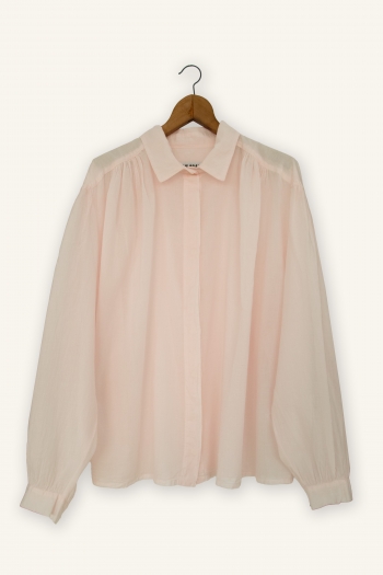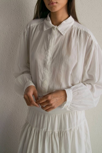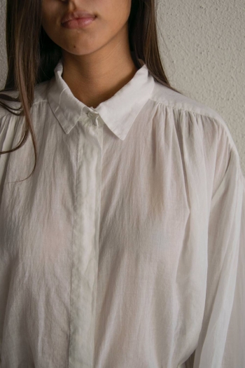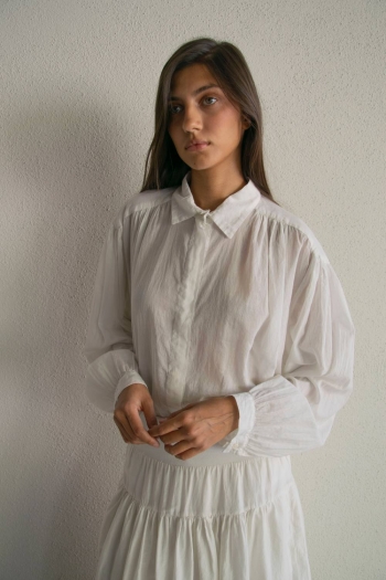 The Vintage voile shirt is crafted from 100% cotton voile, an exceptionally light, soft, and breathable fabric. Its fluid silhouette is shaped by delicate gathers at the shoulders, adding subtle volume and a natural drape.