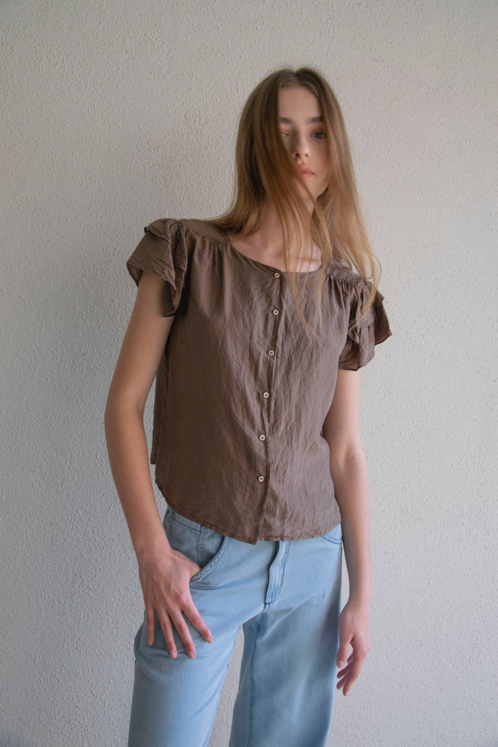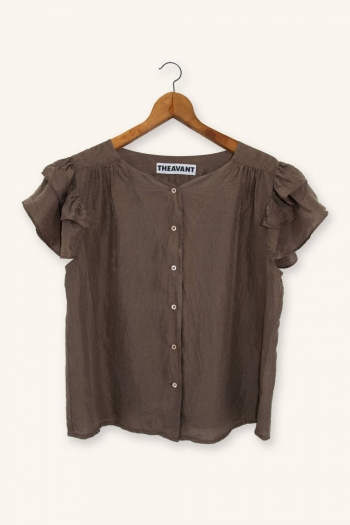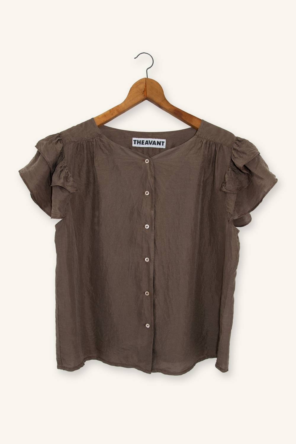La Camisa Romantic está confeccionado en pongé de seda 100%. El pongé es un tejido liviano de fibra natural muy delgado y suave, de trama de hilo densa. Presenta un diseño con mangas cortas y volantes, un cuello redondo cerrado y botones frontales.