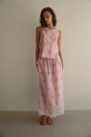 La falda Rose Garden está confeccionada en un popelín de 80% algodón y 20% seda, un tejido ligero y suave con muy poco peso y sutilmente translúcido. Falda amplia de corté evasé con bolsillos laterales. Elástico interior en la cintura que sujeta sin ceñir. Estampado propio producido artesanalmente en Barcelona. Puntilla de color blanco roto cosida alrededor de todo el bajo. Sin forro.