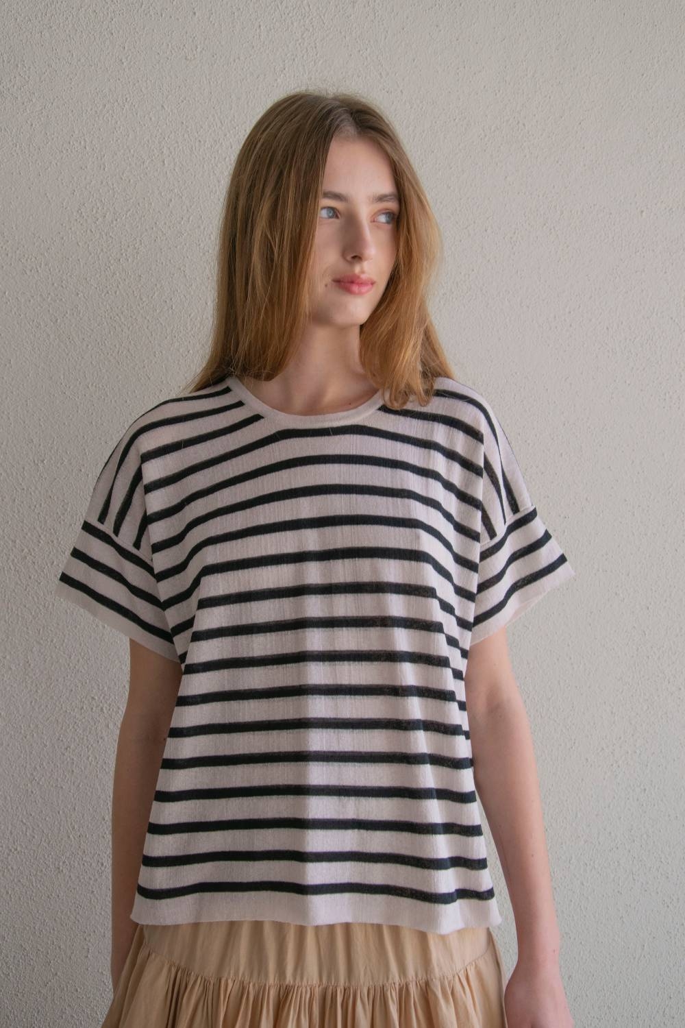 Top oversize de listas, con hombro caído, tricotado con un hilo muy delgado de algodón 100% en un punto tubular (dos capas) con un acabado de crêpe. Prenda muy ligera con un entramado transpirable. Fabricado con una maquinaría japonesa Shima (fully-fashioned) en nuestro taller en Barcelona.