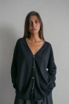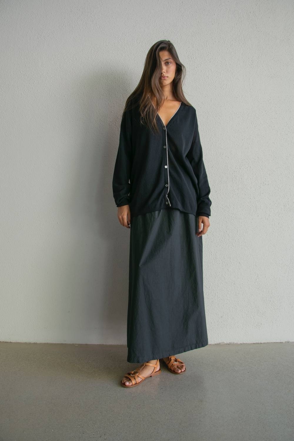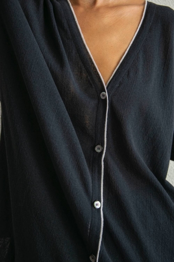 Confeccionado en organza de algodón 100%, el cardigan Navy destaca por su ligereza y su transparencia sutil. El escote en V profundo y la botonadura frontal aportan una línea limpia y femenina, mientras que el contraste delicado en el ribete realza la silueta. Una prenda etérea y elegante.