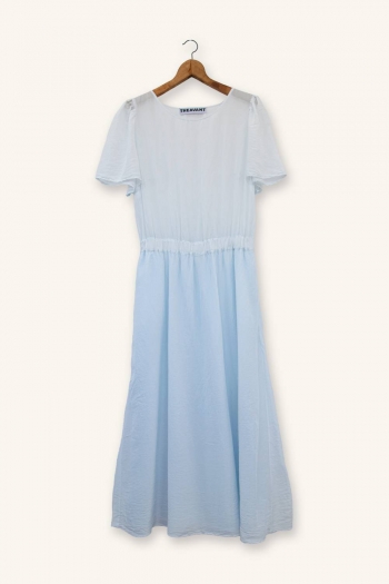 El vestido Coquette está confeccionado en pongé de seda 100%, y la falda interior es de un voile de algodón 100%. El pongé es un tejido liviano de fibra natural muy delgado y suave, de trama de hilo densa. La manga está ligeramente fruncida y la parte superior (o cope) es amplia. La falda está forrada para evitar transparencias sobre todo en los colores claros. El cuerpo del vestido es medio entallado. La cintura tiene un elástico interior que sujeta sin ceñir. La falda del vestido es evasé y amplia. Como es un tinte en prenda, el tono del tejido es más intenso en el algodón (forro) que en la seda.