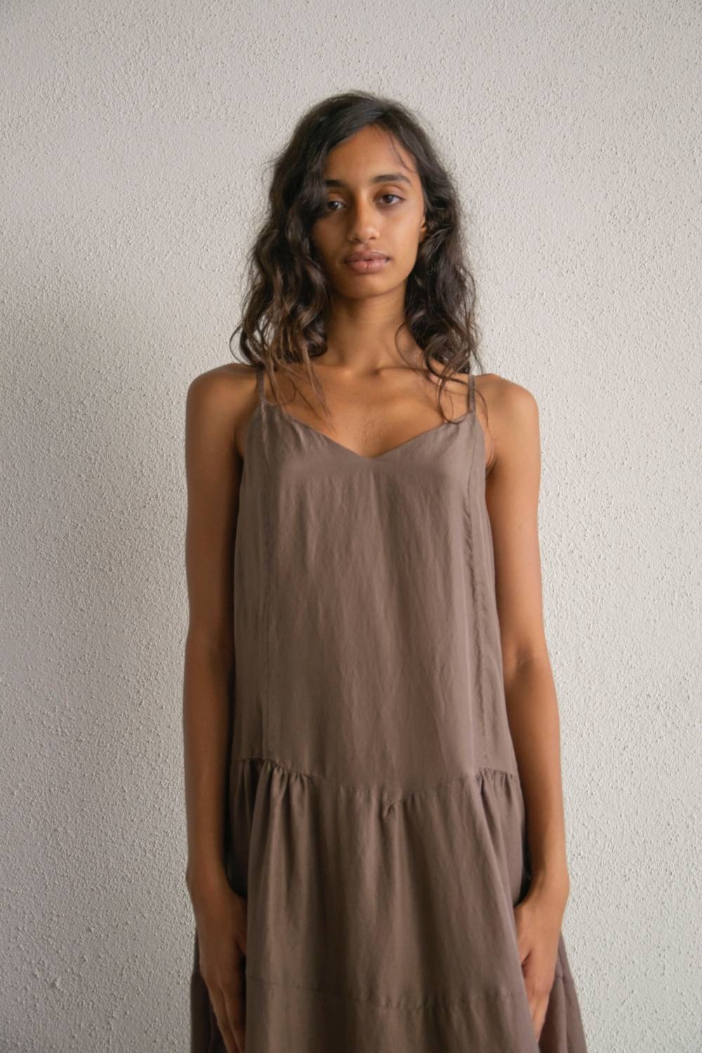 El vestido Martini está confeccionado en pongé de seda 100%, un tejido suave, fluido y ligeramente satinado, conocido por su caída elegante y su tacto delicado. El cuerpo del vestido es entallado, sin holgura.