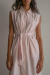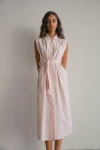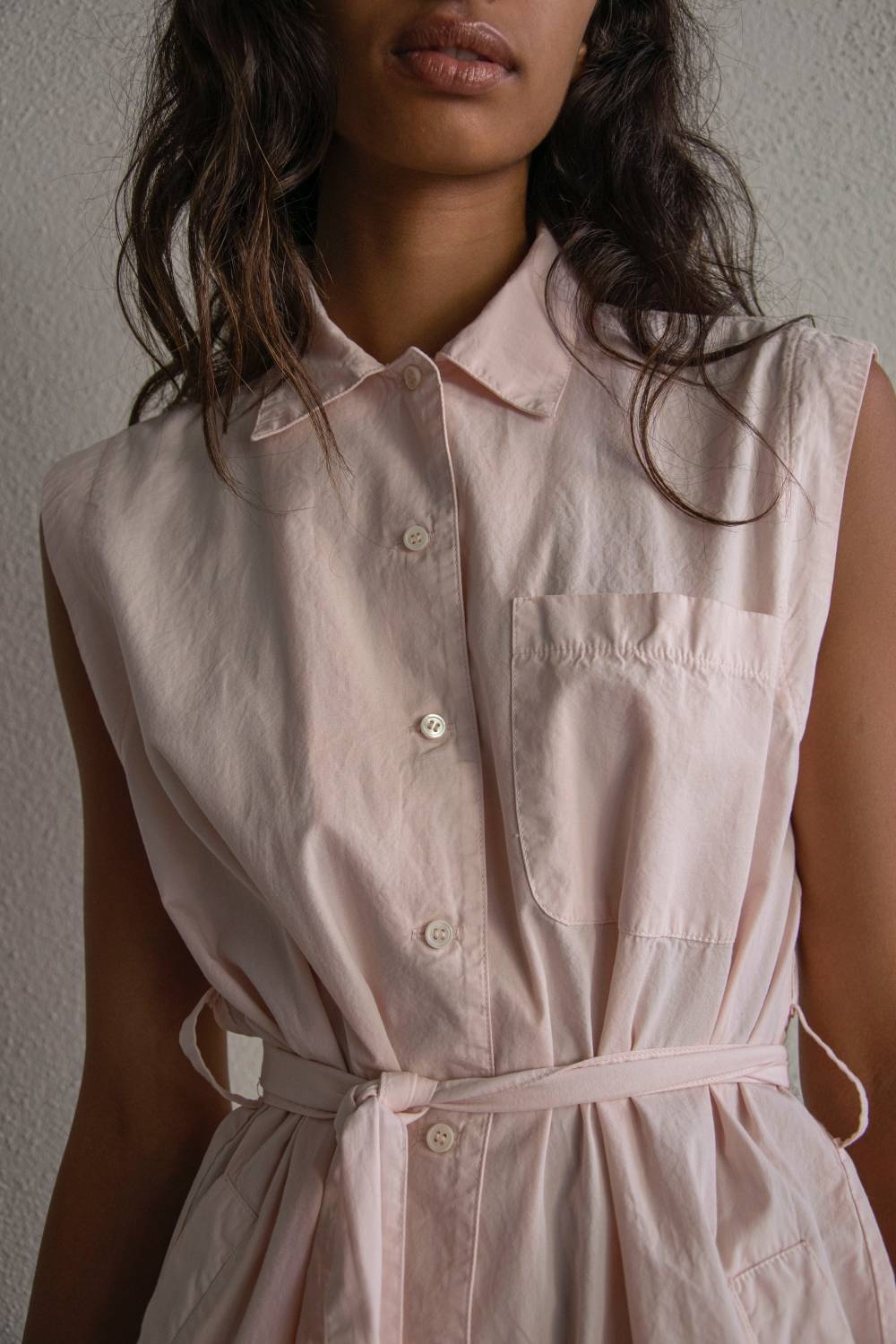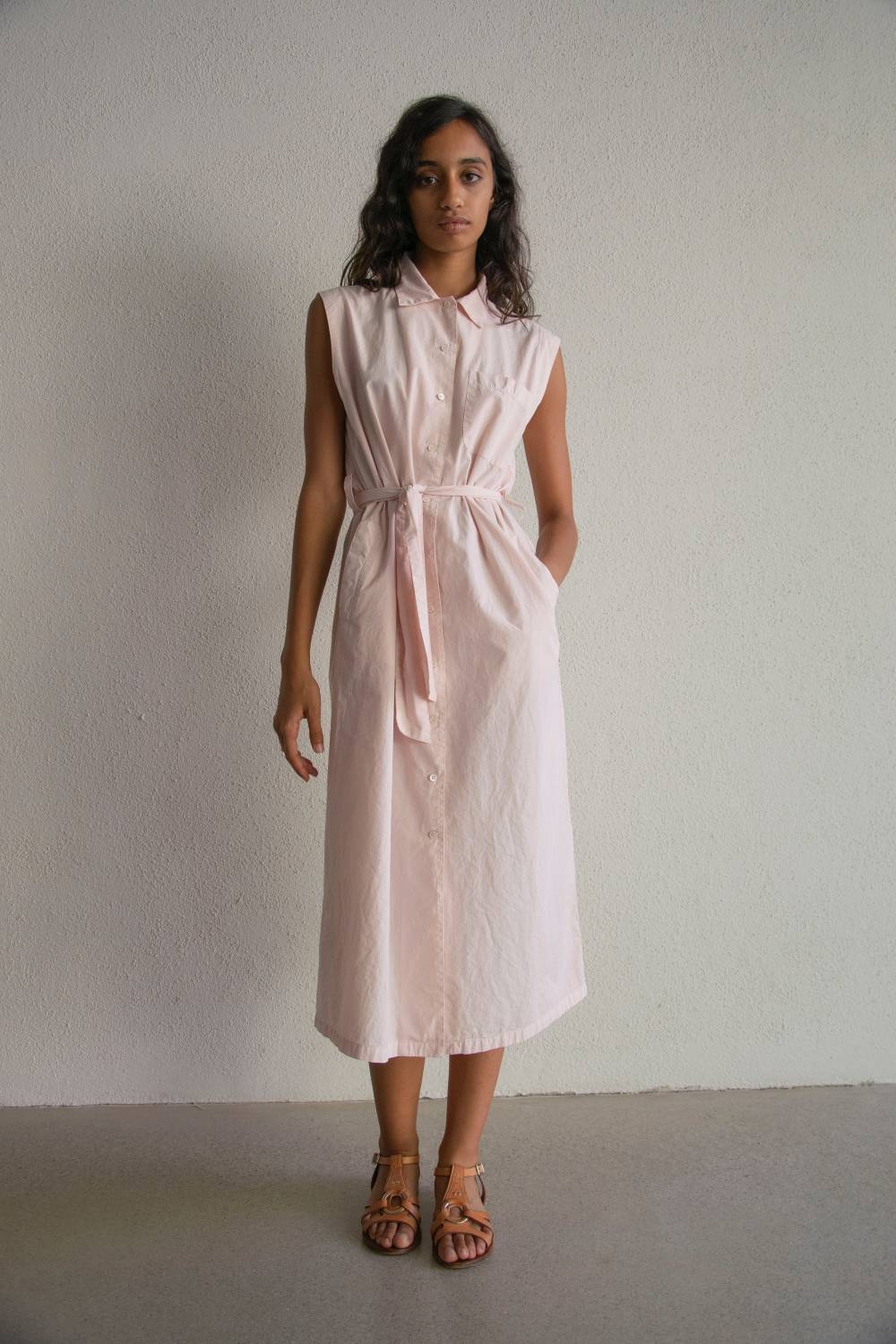 El vestido Riviera está confeccionado en popelín 100% algodón, un tejido tupido, sin elastano, con cuerpo y estructura. El teñido en prenda le aporta un tacto suave. El cinturón del mismo tejido permite ajustar la cintura y modular la silueta según se desee. Un largo midi.